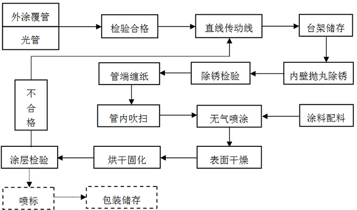 注: 1、3PE生產(chǎn)線進(jìn)管 2、進(jìn)管臺(tái)架 3、直線輸送輥道 4、除塵器 5、內(nèi)噴涂進(jìn)管臺(tái)架 6、鋼管內(nèi)壁除銹設(shè)備