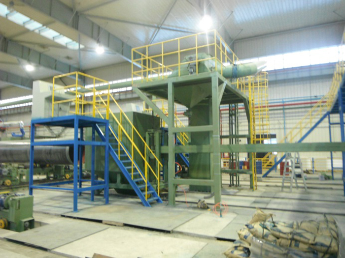 功能描述:內(nèi)壁拋丸除銹系統(tǒng)包含液壓站驅(qū)動(dòng)車、輸砂伸臂、拋頭、提升機(jī)、分離器、回丸系統(tǒng)、打砂前倉、轉(zhuǎn)管裝置(或轉(zhuǎn)管車)、打砂后倉等。鋼管內(nèi)壁預(yù)熱后(高于室溫3°以上)轉(zhuǎn)運(yùn)到內(nèi)壁除銹工位,前后倉將鋼管兩端密封,鋼管旋轉(zhuǎn)。液壓站、提升機(jī)、分離器、回丸系統(tǒng)、輸砂皮帶、拋頭馬達(dá)依次開啟,打開漏砂閥向前移動(dòng)拋頭直至鋼管末端,然后返回到初位置。