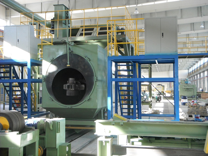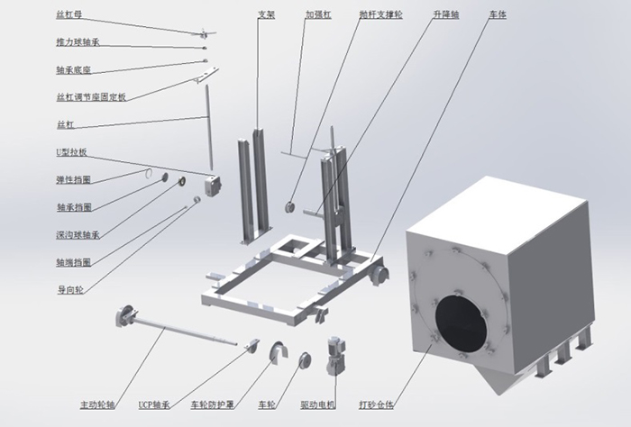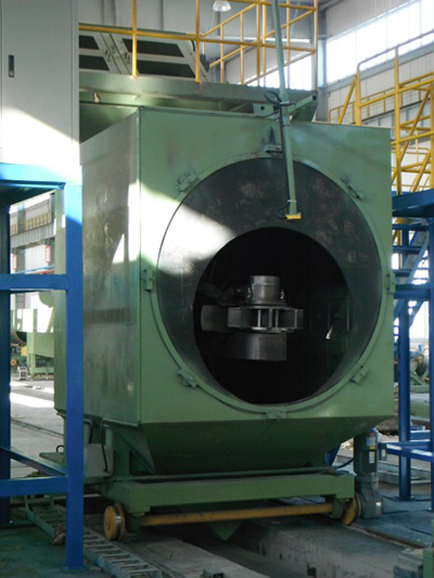 功能描述:內(nèi)壁拋丸除銹系統(tǒng)包含液壓站驅(qū)動(dòng)車、輸砂伸臂、拋頭、提升機(jī)、分離器、回丸系統(tǒng)、打砂前倉(cāng)、轉(zhuǎn)管裝置(或轉(zhuǎn)管車)、打砂后倉(cāng)等。鋼管內(nèi)壁預(yù)熱后(高于室溫3°以上)轉(zhuǎn)運(yùn)到內(nèi)壁除銹工位,前后倉(cāng)將鋼管兩端密封,鋼管旋轉(zhuǎn)。液壓站、提升機(jī)、分離器、回丸系統(tǒng)、輸砂皮帶、拋頭馬達(dá)依次開(kāi)啟,打開(kāi)漏砂閥向前移動(dòng)拋頭直至鋼管末端,然后返回到初位置。