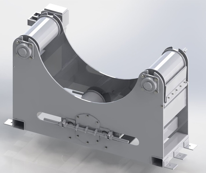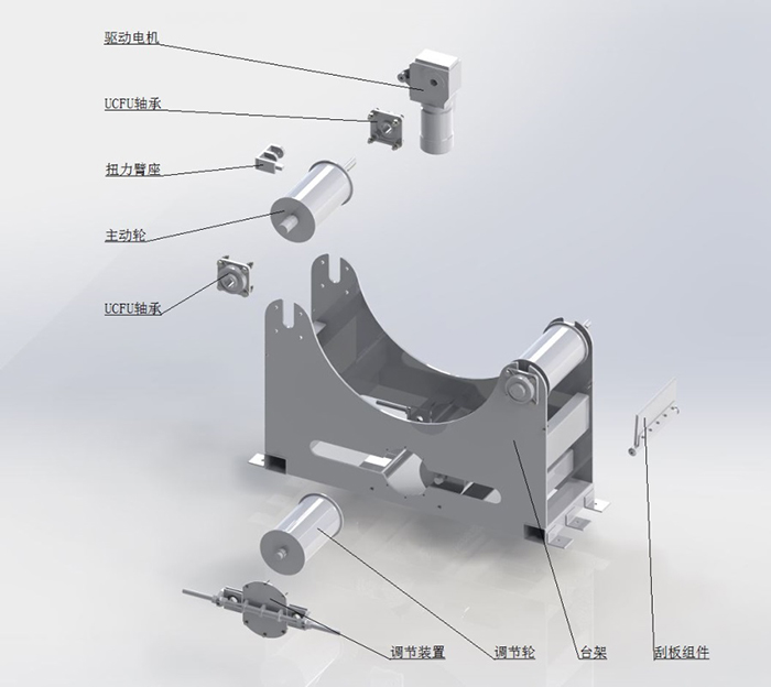 功能描述:轉(zhuǎn)管裝置包含主動輪、調(diào)節(jié)輪、橡膠帶等。完成配重層的鋼管由運管車托舉平穩(wěn)的放在轉(zhuǎn)管裝置上,主要是對管端的配重層進行管端配重層切割或損傷修復(fù)。