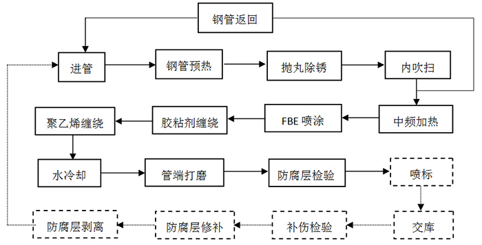 7、檢測平臺8、廢管返回直線輥道 9、廢管返回臺架 10、涂覆螺旋輥道 11、中頻加熱裝置 12、FBE噴涂裝置