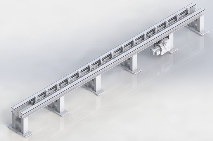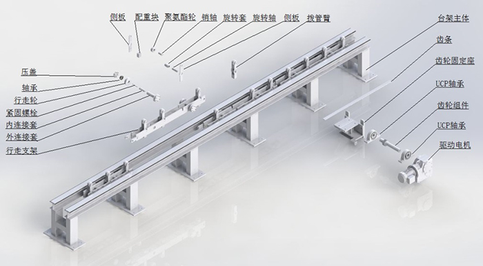 功能描述:臺架在生產(chǎn)線中用于各個工序之間,存儲和運(yùn)輸鋼管的作用。臺架上鋪設(shè)聚氨酯板或PE板(根據(jù)客戶要求,常規(guī)厚度15mm),保護(hù)鋼管除銹后外壁錨紋深度及涂覆后的PE層。由2條型鋼組成,可滿足鋼管承重要求,臺架設(shè)置一定的斜度,臺架立柱間隔2m左右。立柱同地基采用化學(xué)錨栓固定,擋管器固定于臺架上,撥管及上下管裝置放置于臺架兩側(cè)。